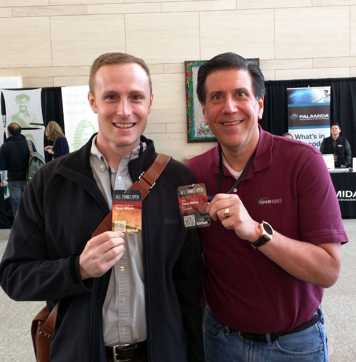 Monday night there was an event sponsored by GitHub followed by a Speaker/Sponsor dinner at the Sheraton hotel. At our table sat Gianugo from Microsoft (who helps out OpenNMS with an MSDN subscription) and Jono from Bad Voltage (who, well, we’re not sure what Jono does but we think it’s positive). When I met them earlier in the day I wanted to do that whole David Letterman “Uma/Oprah” bit from the Oscars: Gian … Jono. Jono … Gian.
