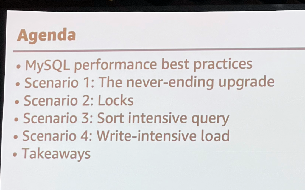 In the afternoon I went to a second session by AWS, this one focused on troubleshooting issues with MySQL on Amazon RDS.
