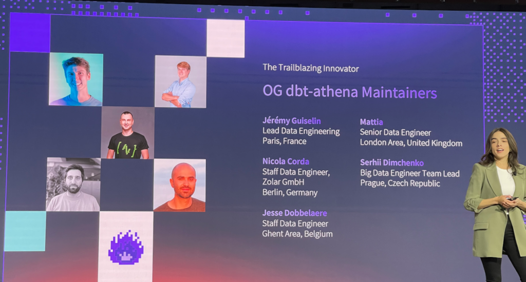 I was extremely happy to see my friends on the dbt-athena adapter get the Trailblazing Innovator award. Last year at Coalesce, my boss David Nalley made a special reference to this team, made up of Jérémy Guiselin, Nicola Corda, Jesse Dobbelaere, Mattia Sappa, and Serhii Dimchenko, who had created an adapter that was so well made it achieved, this year, “trusted” status and, as was mentioned above, is now supported in dbt Cloud as well as dbt Core.